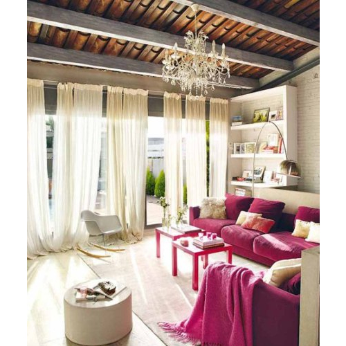 Rèm cửa ren hoặc vải cotton, voan là một đặc điểm không thể thiếu trong phong cách vintage. Bạn có thể tạo nên điểm nhấn với sự "nổi loạn" trong phòng khách với màu hồng đầy lôi cuốn. Sự cổ điển của vintage kết hợp với màu sắc hiện đại khiến cho phòng khách của bạn thực sự vô cùng cá tính.